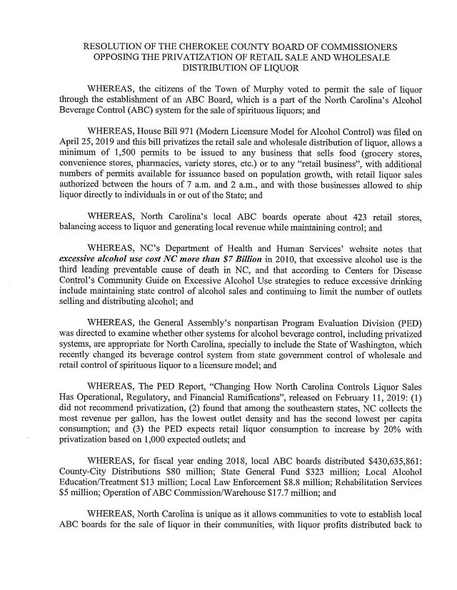 MURPHY, N.C. -Cherokee County Commissioner C.B. McKinnon, District 2 (Republican), stated, “We shouldn’t be in the pot business or the liquor business” after the ‘Resolution of the Cherokee Board of Commissioners Opposing the Privatization of Retail Sale and Wholesale Distribution of Liquor’ was introduced at Monday’s meeting. Emotions were high as the Commissioners debated the issue.